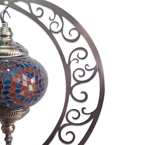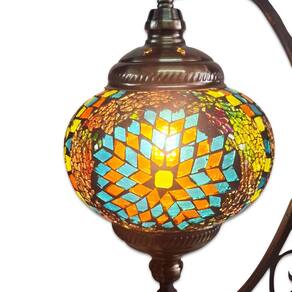 Lindo Abajur de mesa decorativo Turco, com suporte de metal bronzeado e cúpula circular artesanal em mosaico de vidros.