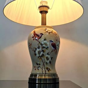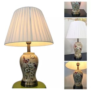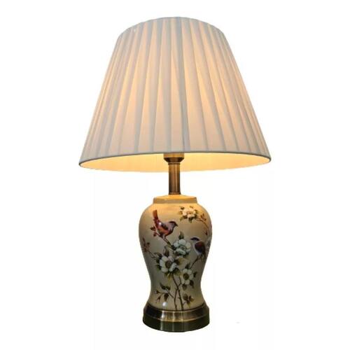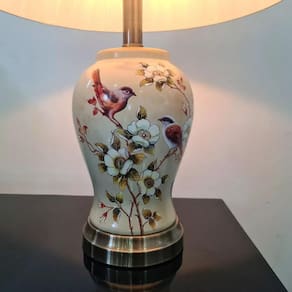 Este abajur possui tamanho harmônico compatível com ambiente, design moderno, da linha importada Flowers, base de porcelana na cor Bege e estampa floral com pássaros, pés resistente em metal na cor dourado escuro e com excelente aderência a superfície.