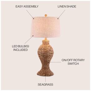 A construção de alta qualidade atende aos padrões UL para 120 volts, garantindo segurança e durabilidade. O abajur inclui lâmpadas LED de economia de energia, que são compatíveis com tomadas inteligentes Alexa vendidas separadamente. O design apresenta uma cúpula de tambor de capa dura em 100% algodão na cor cinza, complementando o estilo costeiro da base.