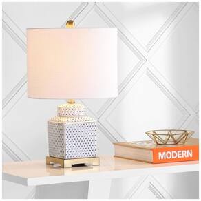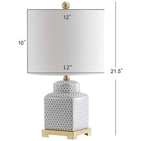 Este elegante candeeiro de mesa apresenta uma base de pote quadrado em gengibre, decorado em azul e branco com um sofisticado padrão de esmalte de rede de pesca, e um suporte de latão que complementa seu estilo clássico. Acompanhado por uma cúpula de tambor em linho, o design adiciona um toque de refinamento a qualquer ambiente.