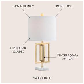 Esta luminária de mesa combina um design contemporâneo e luxuoso com uma estrutura geométrica em latão e uma base que imita mármore. Com um cordão de seda e um remate de latão, ela exala elegância de ponta a ponta. Com 51 cm de altura, é ideal para colocar sobre uma mesa, armário ou mesa lateral.