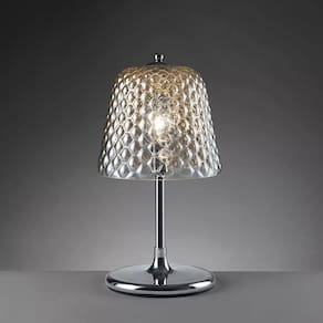 O abajur possui cúpula em vidro lapidado na cor fumê.