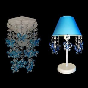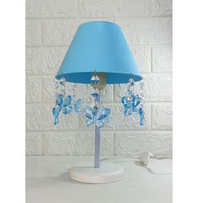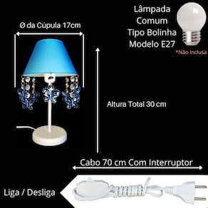 Cúpula de polipropileno plástico resistente na cor azul; Base em acrílico branco haste de acrílico branco; Pingentes borboletas na cor azul, castanhas de acrílico transparente; Altura total do abajur 30 cm. Diâmetro maior da cúpula mede 17 cm; Soquete para lâmpadas modelo e-27 bivolt aceita lâmpadas 110v e 220v ; Usar lâmpada de no máximo 40w lâmpada não incluso ; Marca: Lustres Sh Design Ean: 7806025220842