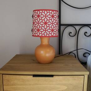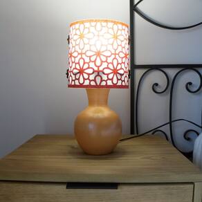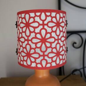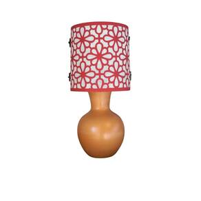 Abajur de mesa com base em cerâmica rústica. Base envernizada. Cúpula revestida com tecido arabesco vermelho. Cúpula medindo 15 cm de diâmetro e 15 cm de altura. Cúpulas co detalhes para fechamento em madeira.Dimensões totais do produto: Altura: 31 cm Largura: 15 cmBivolt. Usar lâmpadas fluorescentes ou LED. Fio preto com plug liga e desliga. Soquete E-27Ficha técnica- Cores: Cerâmica e vermelho- Largura total: 15 cm- Cor do abajur: Vermelho- Altura total: 31 cm- Cor da base: Terracota- Diâmetro total: 15 cm