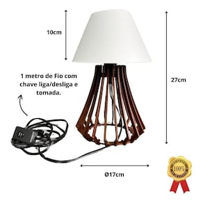 Ficha técnica: Cor das cúpula: preto Medidas com a cúpula: largura: 17cm / altura: 27cm Materiais: madeira mdf com dupla pelicula amadeirada Fio de 1 metro Alimentação: bivolt 110v / 220v Potência: 100 w Ambientes: quarto, sala Capacidade de lâmpadas: 1 Tipos de fontes de luz: soquete e27 Tipo de soquete: e27 Marca: Não Informado Ean: 7893464244065