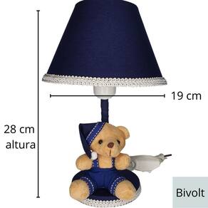 Com uma altura de 28cm, a cúpula do abajur tem 8cm de altura e 19cm de diâmetro. Ele funciona tanto em voltagem 110V quanto 220V, e a lâmpada recomendada é de no máximo 40W, que não está inclusa na embalagem.