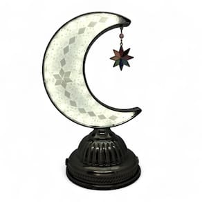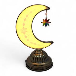 Características do Produto: Altura: 23 cm Iluminação: LED branco, quente e médio Design: Lua crescente com estilo turco Funciona sem fio Alimentação por bateria recarregável Estrutura detalhada com acabamento metálico e toque artesanal