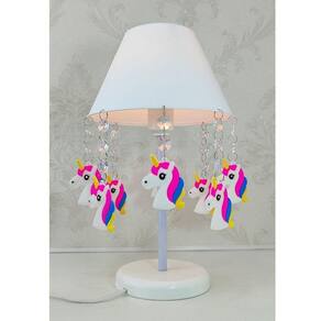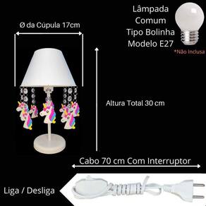 A cúpula do abajur é feita de polipropileno resistente na cor branca, enquanto a base e a haste são de acrílico branco. Os pingentes de unicórnio, feitos de aplique emborrachado, adicionam um toque lúdico e encantador ao abajur. As argolas de inox e as castanhas de acrílico transparente garantem durabilidade e um acabamento especial.