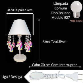 Com altura total de 30 cm e diâmetro maior da cúpula de 17 cm, este abajur é compacto e se encaixa perfeitamente em qualquer cantinho do quarto infantil. O soquete para lâmpadas é do modelo E-27 e é bivolt, aceitando lâmpadas tanto de 110v quanto de 220v. É importante ressaltar que este produto não acompanha lâmpada, sendo necessário utilizar uma lâmpada de no máximo 10W.