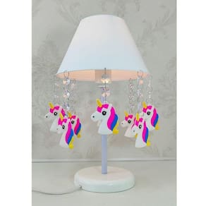 Esta luminária possui uma cúpula de polipropileno resistente na cor branca, que proporciona uma luz suave e aconchegante. Sua base e haste são feitas de acrílico branco, garantindo a estabilidade e durabilidade do abajur. Os pingentes de unicórnio, feitos de aplique emborrachado, adicionam um charme especial ao produto.
