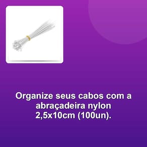 A Abraçadeira de Nylon Western 2,5 x 10 cm é indicada para organização de cabos e fixação de objetos em diferentes aplicações. Com pacote contendo 100 unidades na cor branca, oferece praticidade para uso contínuo em projetos e no dia a dia. Fabricada em nylon, proporciona resistência e durabilidade, contribuindo para maior segurança nas amarrações. Pode ser utilizada em ambientes residenciais, corporativos ou em projetos de bricolagem que exijam agrupamento e organização de fios e pequenos itens. A Western é uma marca que oferece solução funcional para quem busca organização com bom acabamento visual.