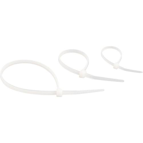 1 Tubo plástico com 300 abraçadeiras de nylon: 100 abraçadeiras 100 mm x 2,5 mm x 1,1 mm, 120 abraçadeiras 140 mm x 3,6 mm x 1,2 mm e 80 abraçadeiras 200 mm x 3,6 mm x 1,3 mm
