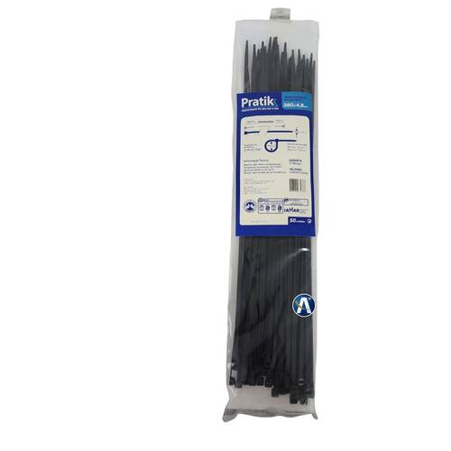 Abraçadeira de Nylon Preta, pacote com 50 unidades. Dimensões: 380X4.8mm. 380mm comprimento 4,8mm largura Material: Nylon 66. Temperatura de exposição: 35º C a 85º C. : 12 meses pelo fabricante. Aguardamos seu pedido Obrigada pela preferência Marca: Não Informado