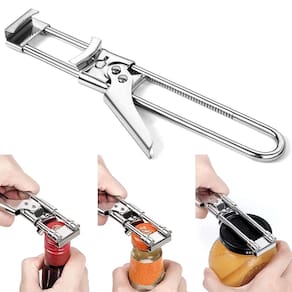 Abridor de Frascos para cozinha, ideal para abrir potes, garrafas e compotas de azeitona, palmitos entre outros conservados. Com o design moderno, obtenha praticidade e agilidade ao abrir os recipientes. Primeiro ajuste a parte frontal do abridor ao tamanho da tampa do pote e, em seguida, pressione a alça para abrir a tampa facilmente. O mandril ajustável, apropriado para tampas de potes com um diâmetro de 0.5-11.2cm. O Material de aço inoxidável extremamente resistente e durável.