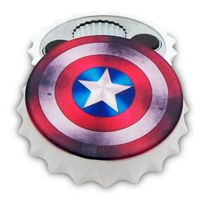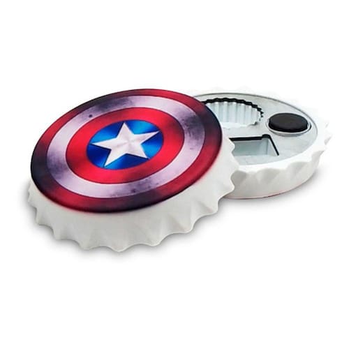 Abridor de Garrafa tipo Tampa com Ima de Geladeira personalizado com o Escudo do Capitão AméricaAbridor de garrafas que enfeita a sua cozinha e sua geladeiraMostre a todos o seu lado descontraído e único, este abridor de garrafas, além de ser um belo enfeite de geladeira, abre garrafas tradicionais e roscáveis fácilmente. Marca: Pomp`s Geek