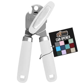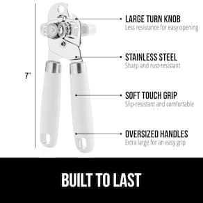 A abertura fácil de latas está aqui; o abridor de latas possui um botão giratório extra grande que permite abrir latas facilmente com pouco esforço, para que você trabalhe com o movimento em vez de contra ele; também inclui uma construção em aço inoxidável para um corte perfeito e alças grandes que facilitam a aderência