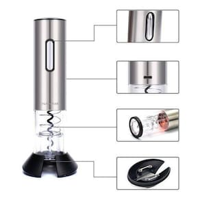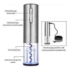 Acompanha: - saca rolha elétrico - corta cápsula - cabo com entrada usb Tamanho 3 x 8 x 3 lxaxp Marca: Bbg Ean: 3325221100429