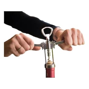 Saca rolhas Classic, abre garrafas de vinho sem esforço e com segurança. Retire o lacre protetor da rolha se houver . Posicione o saca rolhas verticalmente no centro da rolha. Pressione e gire até que a agulha penetre totalmente na rolha. Pressione as duas alavancas laterais para baixo. A rolha começará a ser retirada da garrafa. Em aço cromado, dimensões: 19 x 6,5 cm. Mantenha fora de alcance de crianças.