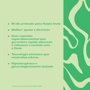 Benefícios e diferenciais - Com cápsulas superabsorventes que garantem rápida absorção e reduzem o contato com o fluxo; - Até 6h de proteção contra vazamentos; - Tecnologia exclusiva que neutraliza odores; - Hipoalergênico e Ginecologicamente Testado; - Cobertura Suave.