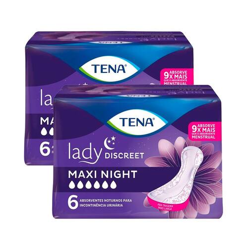 Absorvente para Incontinência Urinária Tena Lady Discreet Maxi Night 6 Unidades Absorvente para Incontinência Urinária TENA Lady Discreet Maxi Night Noturno faz parte da linha TENA Lady Discreet, produtos exclusivos para mulheres com incontinência urinária. Proteção diária para mulheres ativas com perda moderada de urina. TENA Lady Maxi Night foi especialmente projetado para proporcionar uma boa noite de sono. São macias e confortáveis, favorecendo proteção adicional devido ao seu formato específico: são mais largas na parte de trás com maior área de cobertura e extra absorção quando deitado. Produto que você fixa na roupa íntima, evitando que ele se desloque com o movimento; Possui sistema Odour Control™ - Sistema de controle que reduz o risco de odores indesejáveis; Dry Fast Core™ - Núcleo de secagem rápida que absorve e retém o líquido mais rapidamente; Superfície com toque de tecido - Maior conforto e sensação de maciez; Absorve 9x mais que o absorvente menstrual garante segurança e excelente proteção contra vazamentos. Os componentes são atóxicos e pré-testados. Ean: 7896770979034