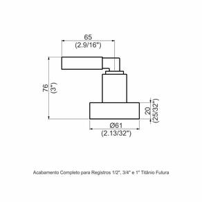 Acabamento Registro Base Fabrimar 1/2 E 3/4 E 1 Pequeno - Titânio Futura Acabamento leve, prático e moderno. Composição básica: liga de cobre e plásticos de engenharia. Acabamento superficial cromado que proporciona alta resistência à corrosão. Volante metálico em forma de alavanca que facilita a abertura. Fácil instalação. Modelo pequeno: para registros DN15 1/2 , DN20 3/4 e DN25 1 . Modelo maior: para registros DN32 1.1/4 e DN40 1.1/2 . Modelos disponíveis para registros base Deca, Perflex, Docol e Fabrimar.
