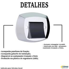 Dados Gerais Acompanha parafusos de fixação; Acompanha gabarito de instalação; Disponível no acabamento cromado com tecla na cor preta. Dados Técnicos Produzido em plástico de engenharia (ABS); Embalagem: blister. Marca: Censi Ean: 7898128476721