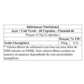Açai Concentrado + Café Verde 60 Cápsulas Vitaminlife O Açai + Café Verde da Vitaminlife é um suplemento que combina os benefícios do açaí e do extrato de café verde em uma formulação prática de 60 cápsulas. O açaí é conhecido por seu alto teor de antioxidantes, que ajudam a combater os radicais livres e promovem a saúde geral. Ele também é rico em ácidos graxos essenciais e fibras, contribuindo para a saúde cardiovascular e o bem-estar digestivo. O café verde, por sua vez, é reconhecido por suas propriedades termogênicas e pode auxiliar no , além de fornecer um impulso natural de energia. Juntos, esses ingredientes criam uma sinergia que não só apoia a saúde metabólica, mas também promove uma maior disposição e foco ao longo do dia. Marca: Não Informado Ean: 7898688161464