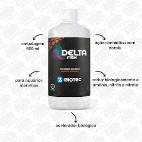 O DeltaFish Marinho apresenta diversos grupos de microrganismos e além de toda diversidade microbiana da linha DeltaFish, possui em sua composição maior quantidade do grupo das bactérias fotossintéticas púrpuras não sulfurosas , que são a base da cadeia alimentar de ambientes marinhos, pois elas fixam o dióxido de carbono para formar matéria orgânica que é liberada na forma dissolvida e utilizada por outros grupos de bactérias como fontes de alimento. Elas também são responsáveis pela neutralização do gás sulfídrico até sulfatos, o que vai reduzir os odores indesejáveis e auxiliar na assimilação e solubilização dos fosfatos orgânicos e inorgânicos. A diversidade dos microrganismos contribui também para a ação mutualística com os corais, onde as bactérias se alimentam de substâncias orgânicas produzidas pelos corais e os protegem de outros microrganismos patogênicos. As bactérias presentes na formulação auxiliam na solubilização de nutrientes, principalmente o nitrogênio, e os fornecem para os corais, aumentando sua qualidade de vida. Embalagem:500ml Marca: Delta Fish