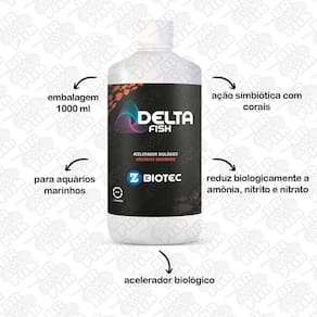 O DeltaFish Marinho apresenta diversos grupos de microrganismos e além de toda diversidade microbiana da linha DeltaFish, possui em sua composição maior quantidade do grupo das bactérias fotossintéticas púrpuras não sulfurosas , que são a base da cadeia alimentar de ambientes marinhos, pois elas fixam o dióxido de carbono para formar matéria orgânica que é liberada na forma dissolvida e utilizada por outros grupos de bactérias como fontes de alimento. Elas também são responsáveis pela neutralização do gás sulfídrico até sulfatos, o que vai reduzir os odores indesejáveis e auxiliar na assimilação e solubilização dos fosfatos orgânicos e inorgânicos. A diversidade dos microrganismos contribui também para a ação mutualística com os corais, onde as bactérias se alimentam de substâncias orgânicas produzidas pelos corais e os protegem de outros microrganismos patogênicos. As bactérias presentes na formulação auxiliam na solubilização de nutrientes, principalmente o nitrogênio, e os fornecem para os corais, aumentando sua qualidade de vida. EMBALAGEM: 1000ml Marca: Delta Fish Ean: 7898996249793