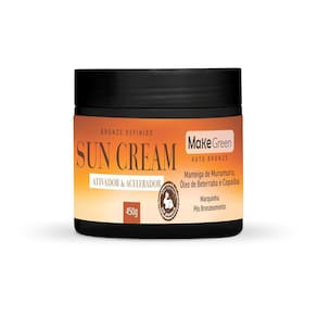 Acelerador E Ativador De Marquinha Bronze Bronzeador Turbo Sun Cream Makegreen - 450Grs É um creme de auxílio para quem gosta de marquinhas pós bronzeamento. Com uma fórmula testada dermatologicamente e composto por manteiga de murumuru, óleo de beterraba e óleo de copaíba , ela ajuda a deixar o bronzeado mais vivo e definido. Modo de Uso : Apele deve estar limpa e livre de resíduos como cremes , óleos, maquiagens, perfumes, etc, pois podem ocasionar manchas.O produto deve ser aplicado com luvas: aplique uma quantidade generosa, espalhando bem para que a pele absorva todo o produto. Sendo assim obterá um melhor resultado de cor , além de evitar manchas. Após a exposição lavar as partes que recebeu o produto com sabonete suave e água corrente. Manter a pele sempre hidratada com produtos apropriados. Marca: Makegreen Cosméticos