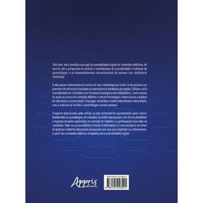 Este livro, sob a temática principal de acessibilidade digital em conteúdos didáticos, foi escrito sob a perspectiva de análise e contribuições da acessibilidade à melhoria da aprendizagem e ao desenvolvimento comunicacional de pessoas com deficiência intelectual. A obra possui intervenções da autora em sua metodologia por tratar-se de pessoas que precisam de estímulos orientados na execução das atividades planejadas. Utilizou-se da acessibilidade em conteúdos com formatos estrategicamente adaptados e, como recurso de apoio ao ensino do conteúdo didático, o uso de tecnologias convencionais e digitais da informação e comunicação. Empregou-se também o lúdico diversificado e direcionado, com a intenção de facilitar a aprendizagem dessas pessoas. O agente educacional pode utilizar-se dos instrumentos apresentados para intervir diretamente na aprendizagem de conteúdos no âmbito educacional, com fins de possibilitar o ingresso de jovens aprendizes ao mercado de trabalho e a participação mais ativa na sociedade. Sabe-se que possibilitar o acesso à informação e à comunicação é um dever de qualquer ambiente educacional alcançando com isso uma amplitude no conhecimento, a partir dos conteúdos didáticos adaptados até a acessibilidade digital.