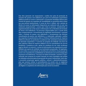 Esta obra apresenta um mapeamento e análise das ações de de inclusão das pessoas com deficiência por parte de instituições arquivísticas públicas quanto ao acesso à informação e recomenda estratégias básicas para orientá-las quanto aos requisitos de acessibilidade na deste acesso nos seus portais institucionais. O cerne do livro é refletir, sob o prisma do direito de acesso às informações disponíveis em ambiente web, se este tem realmente proporcionado o acesso para todas as pessoas, considerando as regulamentações da Lei de Acesso à Informação e da Lei Brasileira de Inclusão da Pessoa com Deficiência. Os percursos empreendidos para a escrita desta obra compreenderam o levantamento da legislação internacional e nacional sobre a inclusão da pessoa com deficiência; o levantamento das diversas conceituações da pessoa com deficiência e a elaboração, aplicação e análise das respostas de questionários sobre as Práticas Informacionais de Arquivos Públicos no Brasil, em particular na ambiente web, incluindo os instrumentos de descrição arquivística. O universo da pesquisa foi definido com base em dois cadastros oficias de arquivos públicos e/ou de custodiadores de acervos brasileiros. Constatou-se que, apesar da existência de um vasto arcabouço legal no Brasil e no exterior, o acesso às informações com requisitos de acessibilidade está aquém da realidade nas instituições pesquisadas. Na legislação, há uma ênfase na normalização do atendimento prioritário e da do acesso com requisitos de acessibilidade em detrimento aos termos designados às pessoas com deficiência. Com base nos dados levantados, concluiu-se apresentando uma proposta de modelo baseada em cinco estratégias que podem ser adotadas como princípios da do acesso à informação, entre elas, a necessária preparação agentes públicos, cultural e administrativamente, para que possam realizar os procedimentos de acordo com as exigências legais; e dos profissionais da informação especificamente voltada à informação digital e à arquitetura da informação para torná-la acessível.