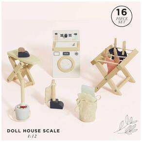 O conjunto de acessórios para lavanderia de casa de bonecas de madeira montada é amigo do meio ambiente, de qualidade premium e seguro. Feito de madeira de alta qualidade, tecido e tintas seguras, este conjunto é perfeito para os pequenos que querem brincar sozinhos ou com amigos.