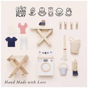 Este conjunto de lavanderia de madeira é perfeito para complementar qualquer casa de bonecas da Le Toy Van. Composto por 17 peças, incluindo uma máquina de lavar, varal, ferro de passar roupa, 4 ganchos, roupas de feltro, um balde de vassoura e um aspirador de pó, este conjunto colorido e educacional incentiva as crianças a fazerem suas tarefas domésticas como fariam em suas casas de madeira de mentira com suas bonecas.