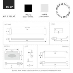 - MEDIDA TÉCNICA CM: (Cabide A5xL3xP6)- (Papeleira A3xL15xP7)-(Porta Toalha A3xL30xP6)-(Saboneteira A2xL14xP10)-(Porta Toalha A3xL50xP6).