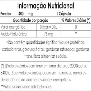 Ácido hialurônico 75mg por cápsula 1 ao dia 60 cápsulas duom - descrição - O ácido hialurônico é uma substância naturalmente presente no organismo humano, uma molécula de açúcar que atrai a água e pode atuar como um lubrificante e absorver choques em partes móveis do corpo como as articulações. Do ácido hialurônico no nosso corpo, 56% dele está na pele, onde ele atua preenchendo o espaço entre as células, o que a mantém lisa, elástica e bem hidratada. O ácido hialurônico ha é um tipo de polissacarídeo composto por dissacarídeos repetidos de ácido d-glucurônico e n-acetil- d-glucosamina. O ha é dispensado em forma de sal de hialuronato. Essa substância é encontrada principalmente em tecidos conjuntivos, como cartilagem, ossos, pele etc. - benefícios - - combate às rugas e linhas de expressão; - tem alto poder de hidratação; - diminui sinais de envelhecimento; - auxilia nas dores de articulações. - sugestão de uso - Tomar 1 cápsula ao dia. - tabela nutricional - Informação nutricional Anexo nas imagens - composição - Ácido hialurônico e antiumectante silicato de magnésio. Composição da cápsula: gelatina e água. - recomendações - Este produto não é um . O ministério da saúde adverte: não existem evidências científicas comprovadas de que este alimento previna, trate ou cure doenças. Não exceder a recomendação diária de consumo indicada na embalagem. Mantenha fora do alcance de crianças. Este produto não é indicado para gestantes, nutrizes mães que amamentam e crianças. Produto destinado a pessoas acima de 19 anos. -conservação-: Conserve ao abrigo de luz, calor e umidade excessiva e com a embalagem fechada. Depois de aberto consumir em até 90 dias. - dados técnicos - Marca - duom. Fabricante - mm laboratório duom eirele. Conteúdo líquido por frasco - 60 cápsulas. Conteúdo líquido total - 60 cápsulas. Rendimento por frasco - 60 porções/doses. Rendimento total - 60 porções/doses. Peso por cápsula - 400mg. Peso líquido por frasco - 24g. Peso líquido total - 24g. Peso bruto por frasco - 50g. Peso bruto total - 50g. Peso aproximado produto + embalagem - 200g. Código de barras ean - 7898665751145. Registro ANVISA- dispensado de registro de acordo com a resolução da rdc 27/2010 e rdc 240/2018 da anvisa. Dimensões do produto - largura: 7 cm; altura: 12,5 cm; comprimento: 7 cm. Dimensões da embalagem/pacote - largura: 13 cm; altura: 7 cm; comprimento: 16 cm. - itens do anúncio - - 1 unidade do produto: Ácido hialurônico 75mg por cápsula 1 ao dia 60 cápsulas duom Total - 60 cápsulas. Ean: 7898665751145