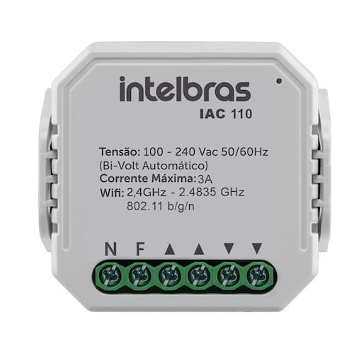 Ficha Técnica Marca: Intelbras Modelo do produto: IAC 110 Comando de voz: Sim Wi-fi: 2,4 GHz - 2,4835 GHz Wi-Fi Alimentação: 100-240 V AC 50 Hz/60 Hz Corrente: 3A Sistemas: iOS/Android Temperatura de operação: -10ºC 70 ºc Garantia: 1 ano Cor: Branco Comprimento do produto: 4,6 cm Largura do produto: 4,6 cm Altura do produto: 1,8 cm Peso do produto: 0,0527kg