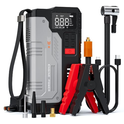 HPBS Motor de arranque de carro com compressor de ar, pacote de bateria portátil 5000A com inflador de pneu de 150 PSI para motores a gás de até 10,0 L e diesel de 8,0 L, caixa de arranque de 12 V com visor LCD - ?Arranque 5000A com compressor de ar?Nosso acionador de partida portátil 5000A liga rapidamente veículos de 12 V (até 10,0 L a gás ou 8,0 L a diesel) em 1-2 segundos. Pode iniciar até 35 vezes com uma carga completa. O compressor de ar embutido infla facilmente pneus, bolas e muito mais. - ?Função inteligente de enchimento de pneu de 150 PSI?O acionador de partida portátil possui uma função inteligente de enchimento do pneu, permitindo que você monitore a pressão do pneu e preajuste o valor desejado. Suporta 3 unidades (BAR/PSI/KPA) e infla pneus 225/60 R18 totalmente em apenas 8 minutos. - ?Potente acionador de bateria de carro?Esta caixa de pular funciona como um carregador portátil com várias saídas USB (5V/3A, 9V/2A, 12V/1,5A) e entrada tipo C (5V/2A, 9V/2A). Também possui uma lanterna LED versátil com 3 modos: lanterna, SOS e estroboscópio, perfeita para emergências ou situações escuras. - ?Tela LCD?Com uma tela LCD exibindo o nível da bateria, modo inflador e pressão do pneu em tempo real, este acionador de partida simplifica o monitoramento do seu status. Remove a ansiedade de adivinhar ou esperar por assistência na estrada em viagens longas. - ?Proteção múltipla?O acionador de partida da bateria do carro vem com um chip inteligente atualizado e 10 proteções de segurança integradas, incluindo sobrecarga, sobrecorrente, curto-circuito, polaridade reversa e muito mais. Grampos inteligentes avançados garantem segurança para você e seu veículo. - ?Atendimento ao cliente?A HPBS oferece uma garantia de produto de 2 anos e suporte ao cliente 24 horas por dia, 7 dias por semana. Sinta-se à vontade para entrar em contato conosco a qualquer momento com qualquer dúvida sobre nossa bateria de arranque.