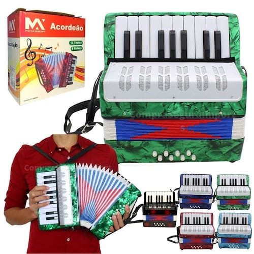 não é apenas um brinquedo, mas um excelente instrumento para incentivar as crianças a darem os seus primeiros passos na música. Instrumento leve, de tamanho reduzido, ideal para crianças de todas as idades. Timbre e tocabilidade idêntica a um acordeon adulto. 17 teclas tipo piano;