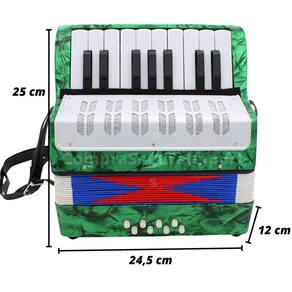 não é apenas um brinquedo, mas um excelente instrumento para incentivar as crianças a darem os seus primeiros passos na música. Instrumento leve, de tamanho reduzido, ideal para crianças de todas as idades. Timbre e tocabilidade idêntica a um acordeon adulto. 17 teclas tipo piano;