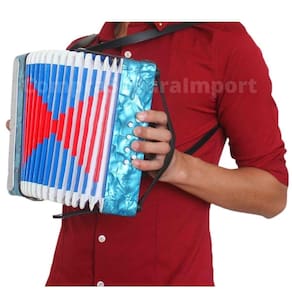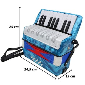 não é apenas um brinquedo, mas um excelente instrumento para incentivar as crianças a darem os seus primeiros passos na música. Instrumento leve, de tamanho reduzido, ideal para crianças de todas as idades. Timbre e tocabilidade idêntica a um acordeon adulto. 17 teclas tipo piano;