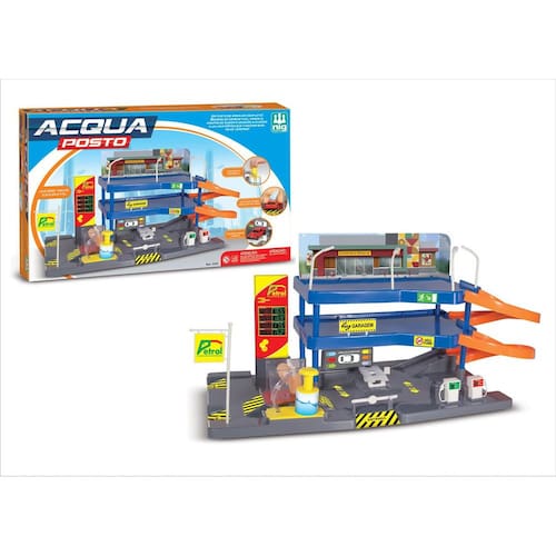 Esse posto de gasolina completo conta com bombas de combustível, cancela, rampas de subida e descida, elevador e um lava rápido que funciona igual ao de verdade. A Nig desenvolveu o mais moderno sistema de bombeamento de água à sucção para este Acqua Posto, garantindo que o abastecimento da bomba e a lavagem completa dos carrinhos sejam feitos de forma divertida e realista.