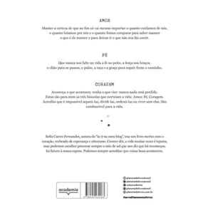 NÃO PERCA O AMOR, A FÉ, A CORAGEM: COISAS MUITO BOAS VÃO ACONTECER Embora não possamos escolher tudo o que viveremos, podemos sim escolher como reagir diante das inevitáveis escolhas que a vida fizer por nós. Isso porque, perante todas as encruzilhadas emocionais que precisamos enfrentar, podemos escolher aprender as lições que elas nos trazem. É verdade: tudo O que acontece em nossas vidas, mesmo que percebamos apenas muito tempo depois, tem uma razão, um propósito, uma aprendizagem. A portuguesa Sofia Castro Fernandes, autora do “às 9 no meu blog”, traz em Acredite, coisas boas acontecem textos recheados de esperança e otimismo que nos mostram que a vida muitas vezes é injusta e difícil, mas também repleta de recomeços e oportunidades de promover e receber o bem.