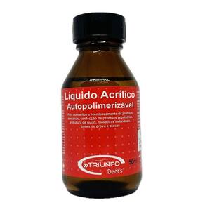 Acrílico Auto Líquido 50ml Resina Consertos Reparos Triunfo Resina Acrílica Auto Polimerizante LÍQUIDO 50ml É necessário misturar com Resina Acrílica PÓ ODONTOLOGIA - Reembasamentos - Consertos e adições de próteses e PPR - Confecção de próteses imediatas provisórias - Confecção de moldeiras individuais - Confecção de bases de prova de - Confecção de placas inter oclusais - Confecção de guias cirúrgicos REPAROS GERAIS - Reparos automotivos - Carcaças de Notebook - Videogames - Modelos de silicone - Reparos em peças de plástico em geral INFORMAÇÕES TÉCNICAS - Produto composto de acetona, ácido cianídrico e álcool metílico - Indicado para consertos e reembasamentos - Validade: 10 anos - Registro na ANVISA: 80772730007 O que vem na caixa - 1 Frasco LÍQUIDO 50ml Marca: Não Informado