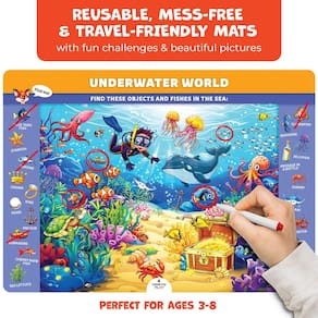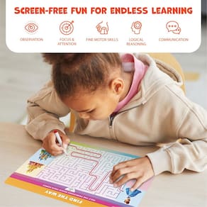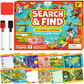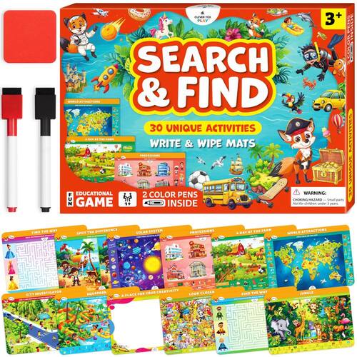 - 30 atividades divertidas – Este jogo de busca e descoberta inclui 15 tapetes de dupla face apagáveis a seco com 30 atividades projetadas para desenvolver atenção, observação, raciocínio lógico, comunicação e habilidades motoras finas - tudo de uma maneira divertida e envolvente.