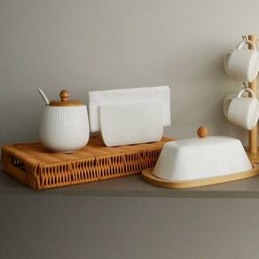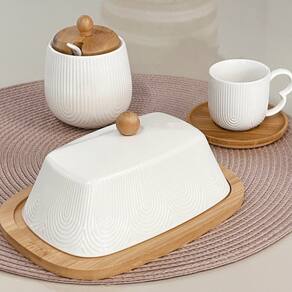 • 1 Açucareiro em Cerâmica com Tampa em Bambu 1 Colher em Cerâmica