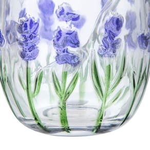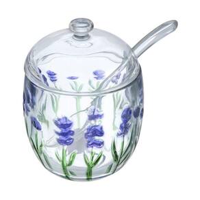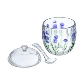 O Açucareiro Fleur é produzido em vidro cristal transparente com capacidade de 240g, apresenta estampa florida com pintura manual em estencil com flores de lavanda. O açucareiro é delicado e traz uma estética romantica para a mesa-posta.