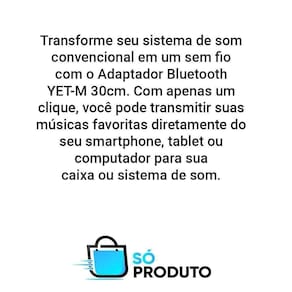 Transforme seu sistema de som convencional em um sistema de som sem fio com o Adaptador Bluetooth YET-M 30cm. Com apenas um clique, você pode transmitir suas músicas favoritas diretamente do seu smartphone, tablet ou computador para sua caixa de som ou sistema de som. Com cabo P2 de 30cm, você tem flexibilidade para posicionar seu dispositivo de forma conveniente. Além disso, o adaptador tem uma qualidade de som cristalina e sem interrupções, para que você possa desfrutar de sua música como nunca antes. Tags: Adaptador Bluetooth, de Música, Cabo P2, Alta Qualidade, Sistema de Som, Sem Fio, Transmissão de Música. IMAGENS MERAMENTE ILUSTRATIVAS Homologação Anatel: 018082113710 Marca: So Produto Ean: 7898704415748