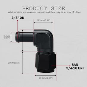 - Tamanho: farpa de mangueira AN8 (3/4-16UNF) fêmea a 3/8" (9,5 mm), 90 graus
