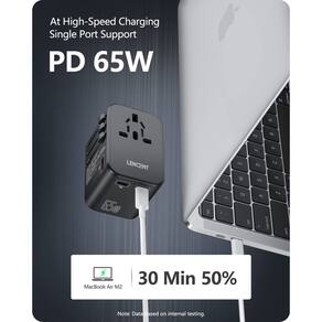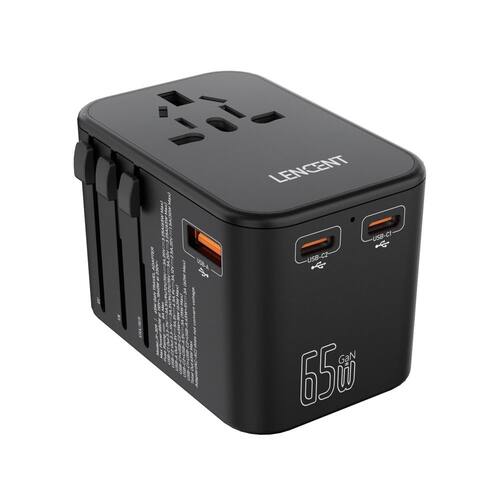 LENCENT Adaptador universal de viagem, carregador de parede mundial GaN III 65W com 1 porta USB e 2 adaptadores de carregamento rápido USB-C PD para iPhone, Samsung, laptop, macbook tipo A/C/G/I (EUA/Reino Unido/UE/EUA)